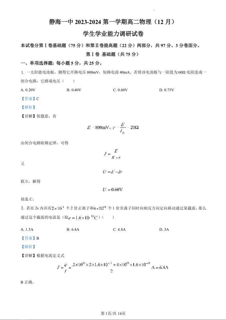 天津市静海区第一中学2023-2024学年高二上学期12月月考物理(精品解析版)