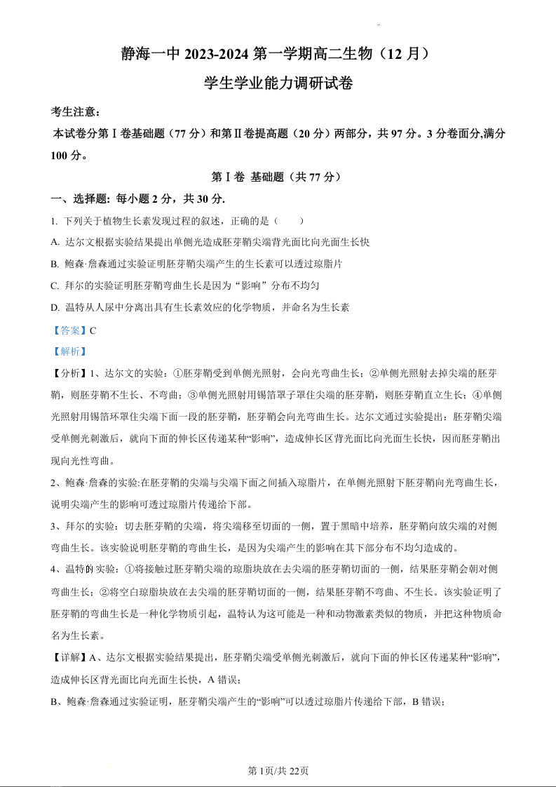天津市静海区第一中学2023-2024学年高二上学期12月月考生物(精品解析版)