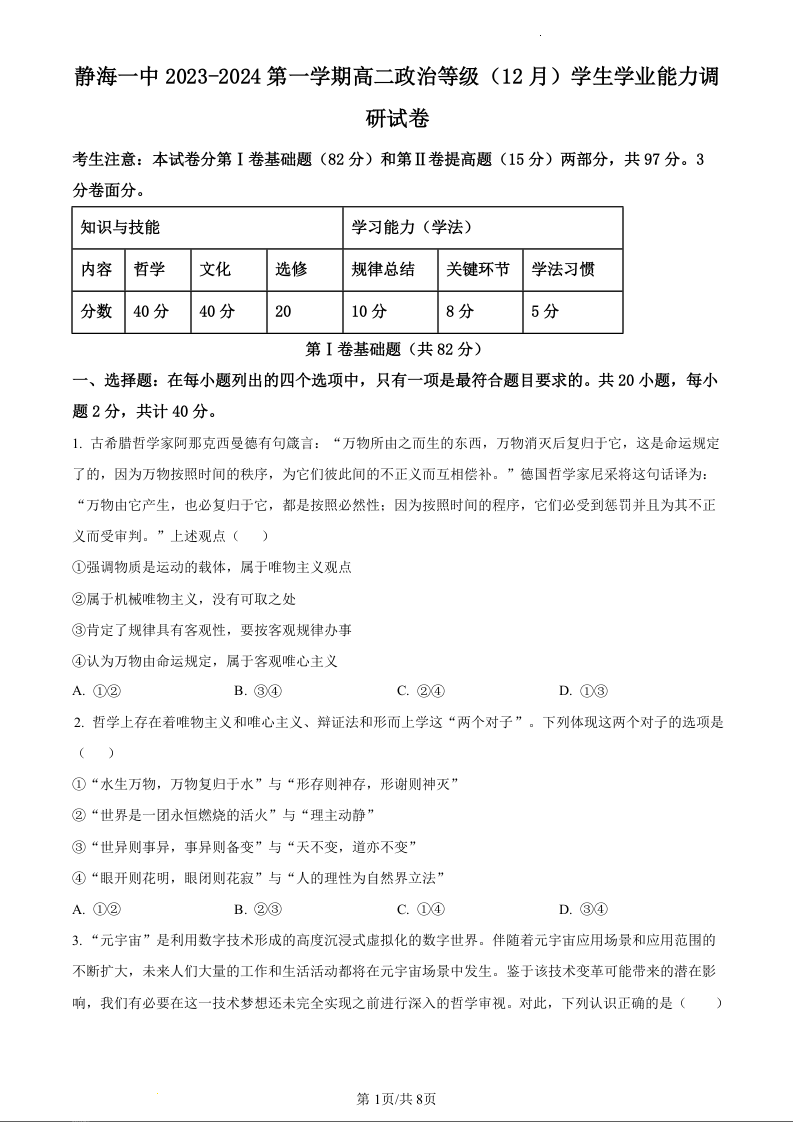 天津市静海区第一中学2023-2024学年高二上学期12月月考政治(原卷版)