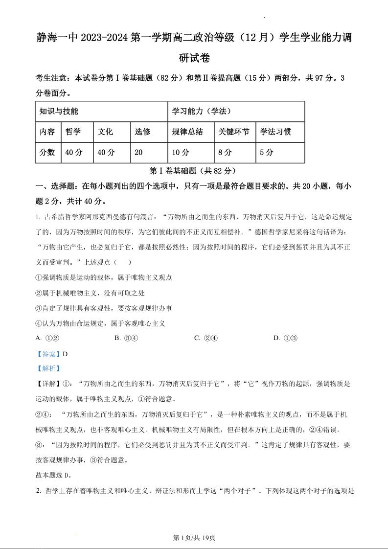 天津市静海区第一中学2023-2024学年高二上学期12月月考政治(精品解析版)