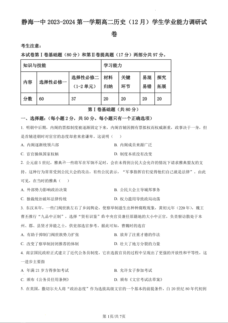 天津市静海区第一中学2023-2024学年高二上学期12月月考历史(原卷版)