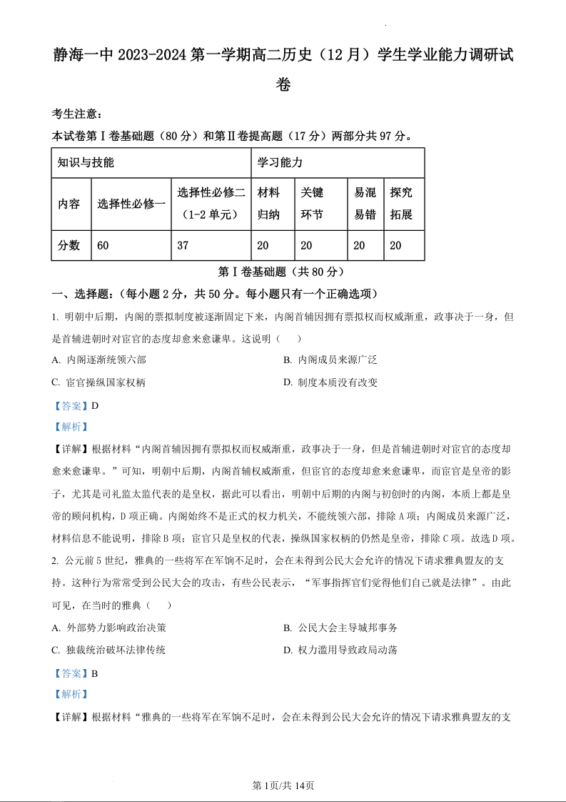天津市静海区第一中学2023-2024学年高二上学期12月月考历史(精品解析版)