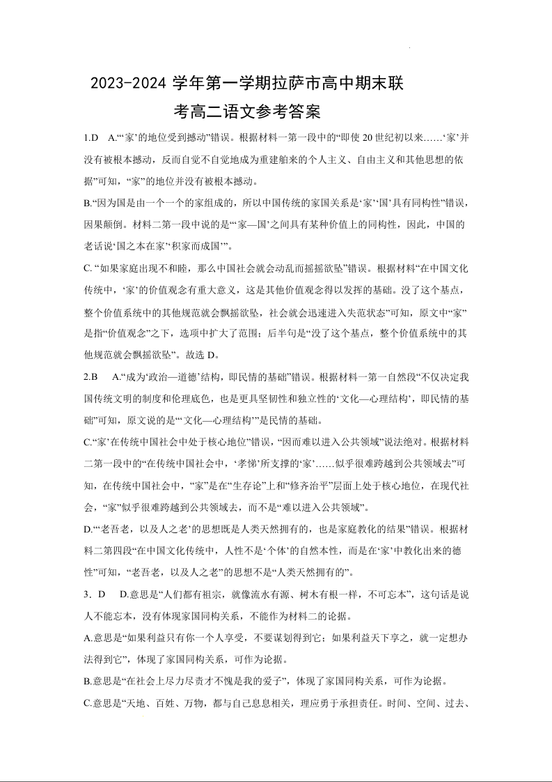 西藏自治区拉萨市2023-2024学年高二上学期期末考试语文答案