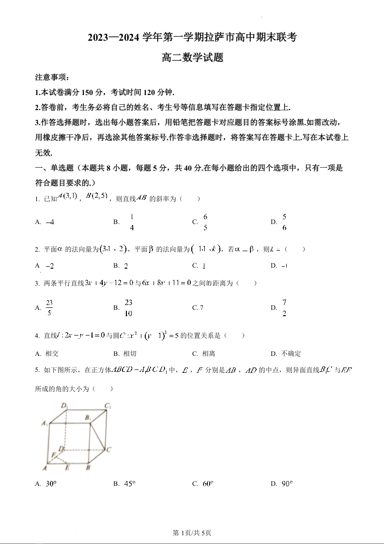 西藏自治区拉萨市2023-2024学年高二上学期期末考试数学(原卷版)