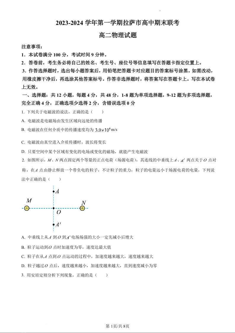 西藏自治区拉萨市2023-2024学年高二上学期期末考试物理(原卷版)