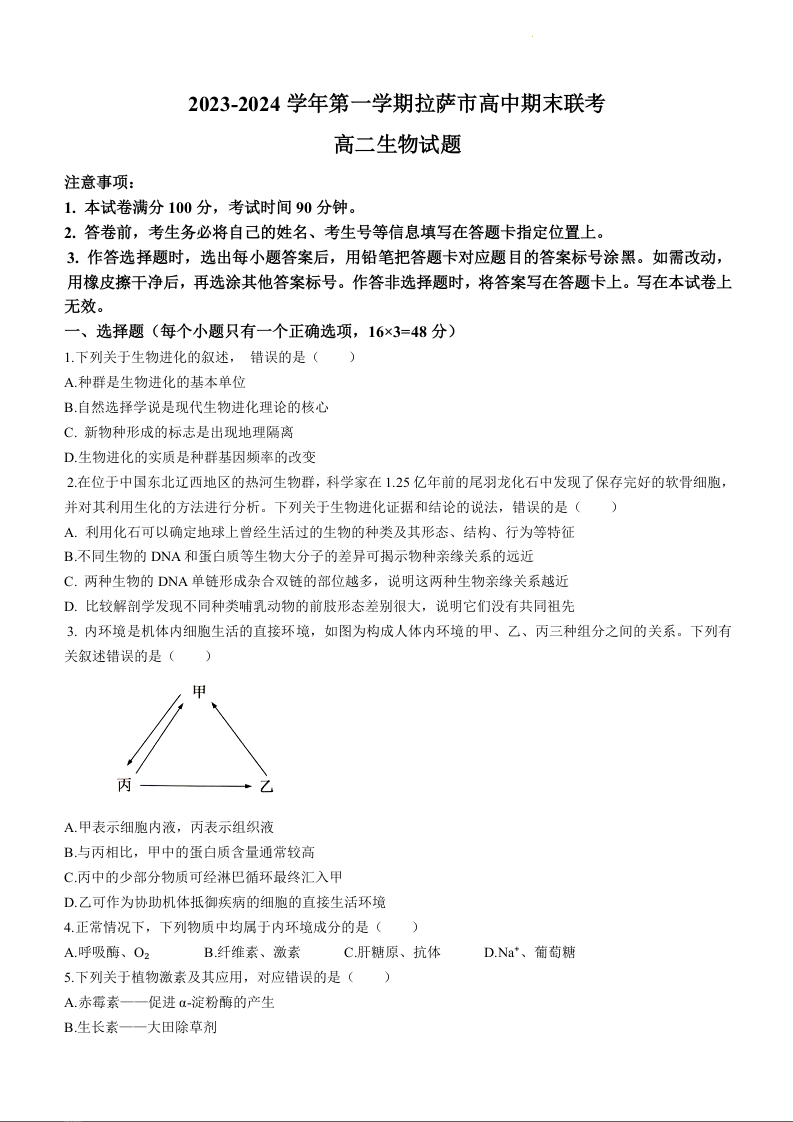 西藏自治区拉萨市2023-2024学年高二上学期期末考试生物