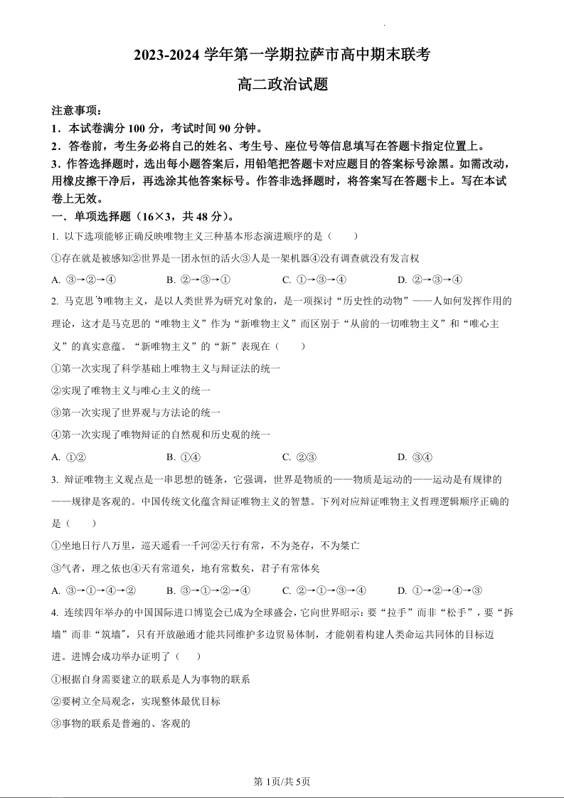 西藏自治区拉萨市2023-2024学年高二上学期期末考试政治(原卷版)