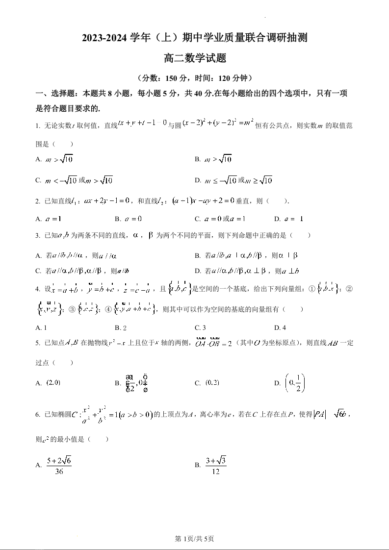 重庆市乌江新高考协作体2023-2024学年高二上学期11月期中考试数学(原卷版)
