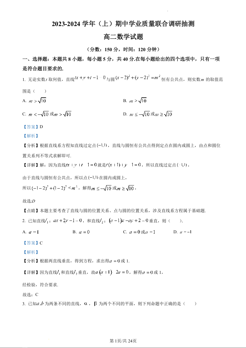 重庆市乌江新高考协作体2023-2024学年高二上学期11月期中考试数学(精品解析版)
