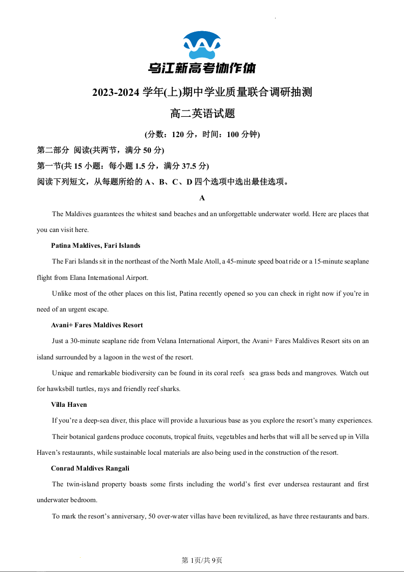 重庆市乌江新高考协作体2023-2024学年高二上学期11月期中考试英语(原卷版)