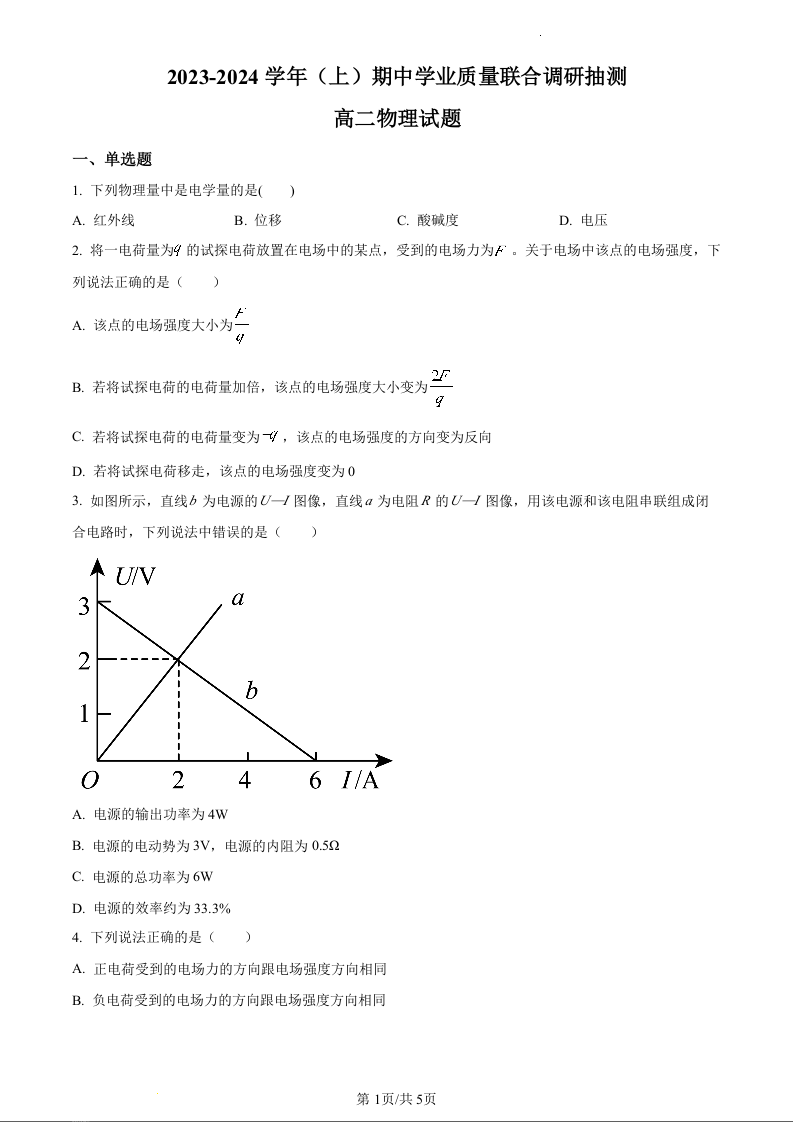 重庆市乌江新高考协作体2023-2024学年高二上学期11月期中考试物理(原卷版)