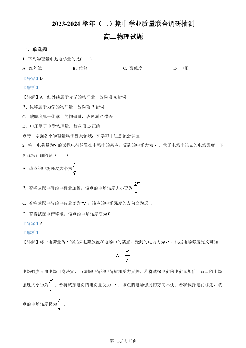 重庆市乌江新高考协作体2023-2024学年高二上学期11月期中考试物理(精品解析版)