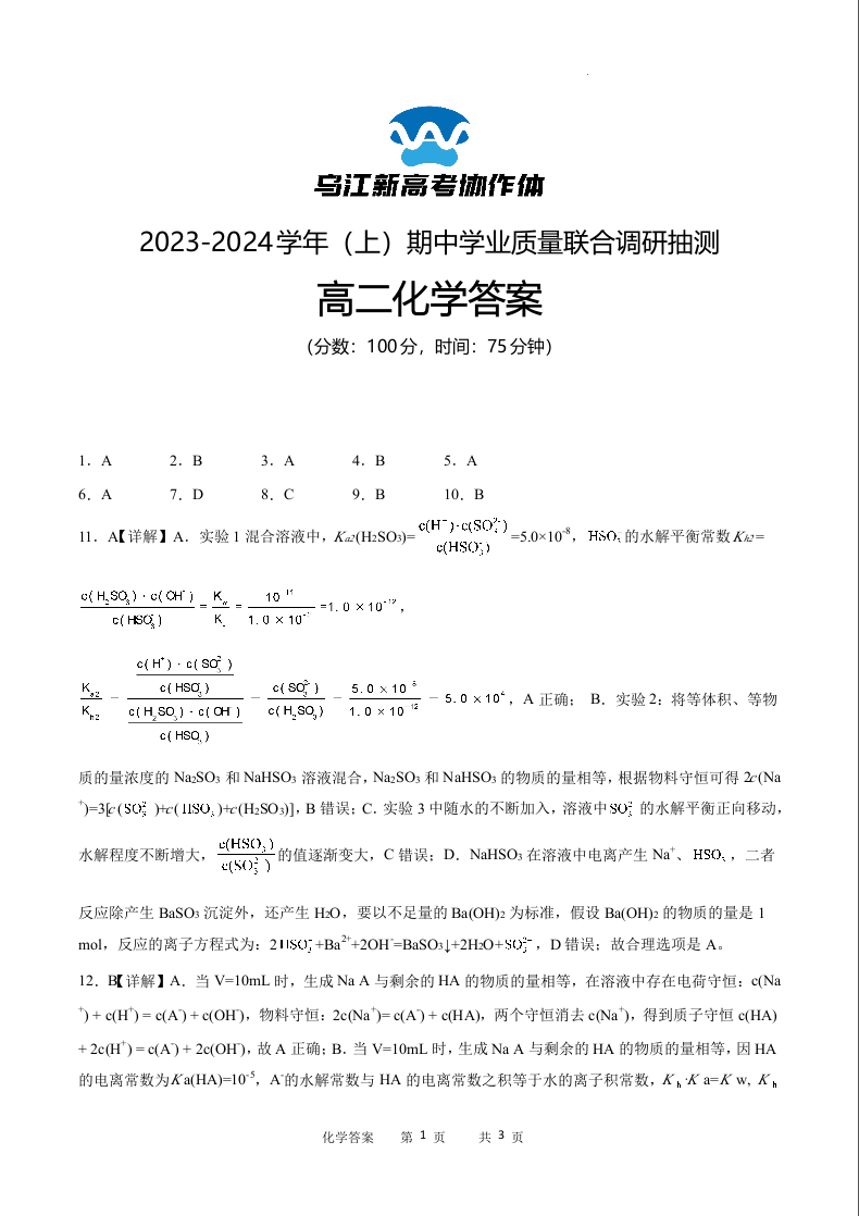 重庆市乌江新高考协作体2023-2024学年高二上学期11月期中考试化学答案