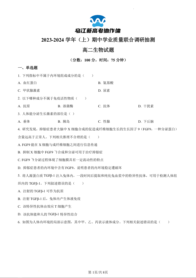 重庆市乌江新高考协作体2023-2024学年高二上学期11月期中考试生物(原卷版)