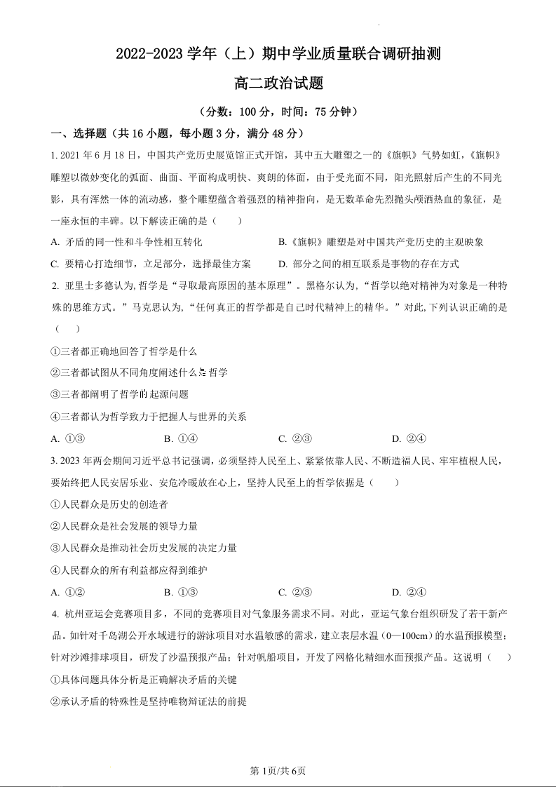 重庆市乌江新高考协作体2023-2024学年高二上学期11月期中考试政治(原卷版)