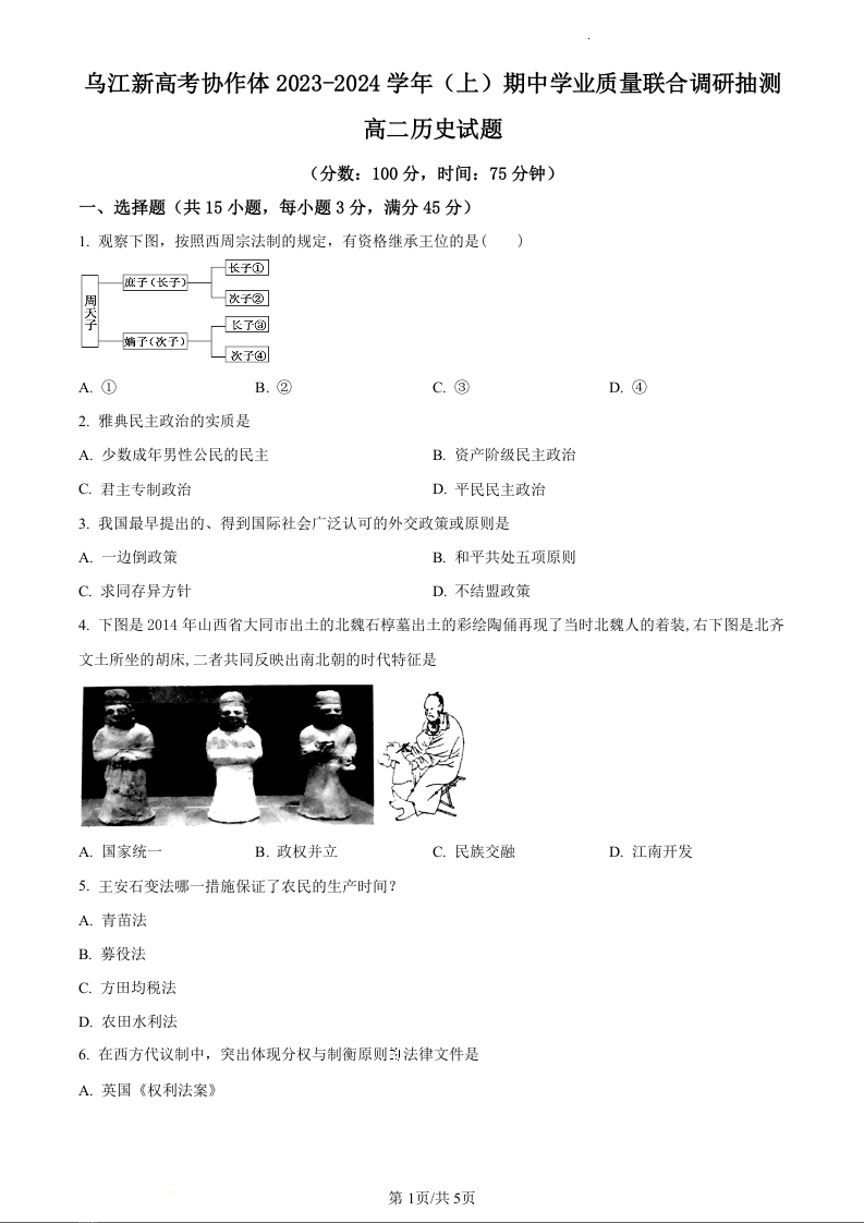 重庆市乌江新高考协作体2023-2024学年高二上学期11月期中考试历史(原卷版)