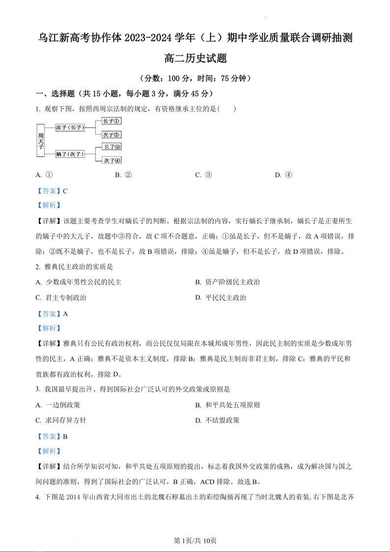 重庆市乌江新高考协作体2023-2024学年高二上学期11月期中考试历史(精品解析版)