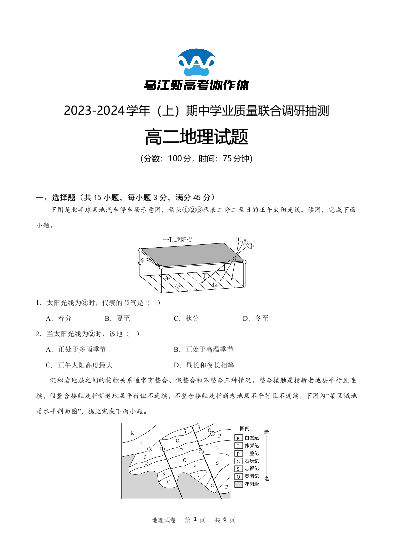 重庆市乌江新高考协作体2023-2024学年高二上学期11月期中考试地理