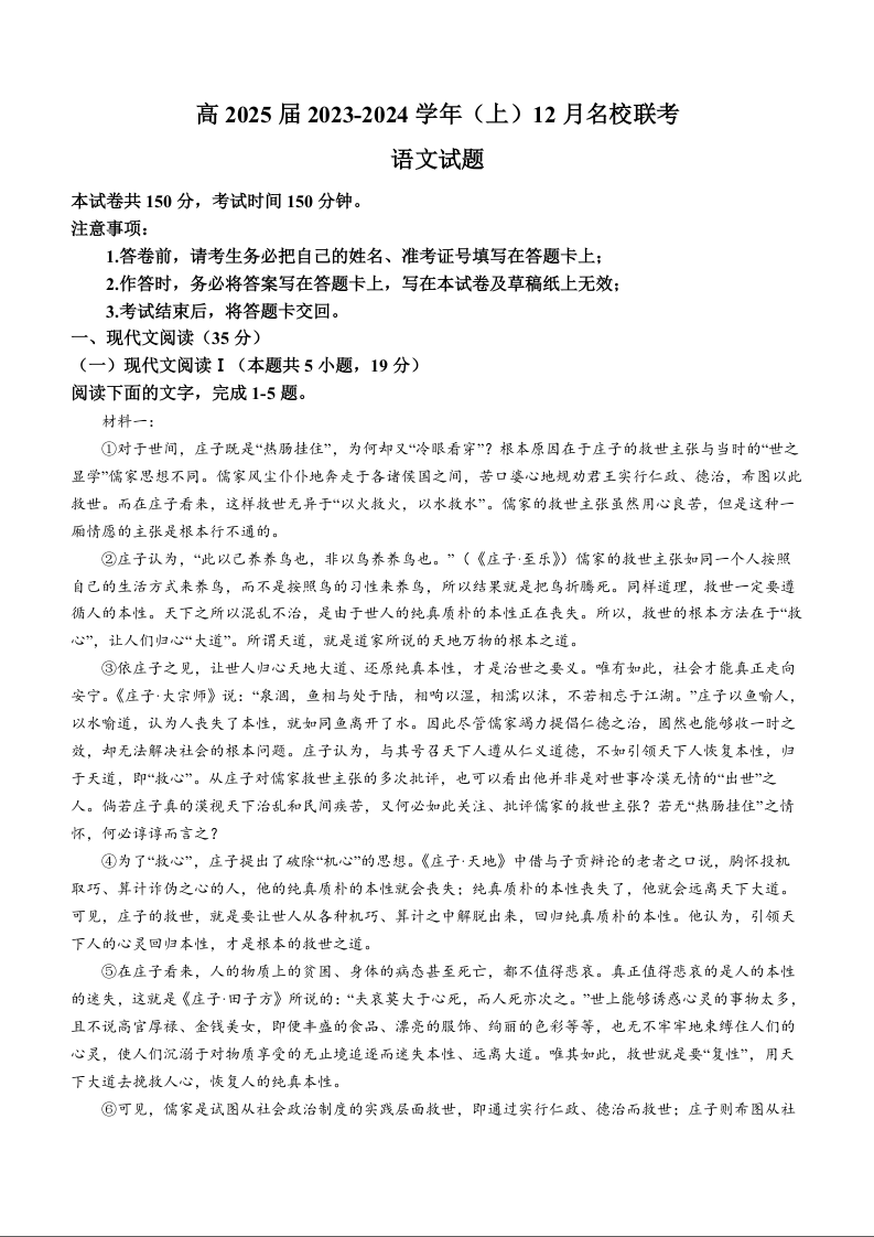 重庆市育才中学、西南大学附中、万州中学2023-2024学年高二上学期12月联考语文+答案