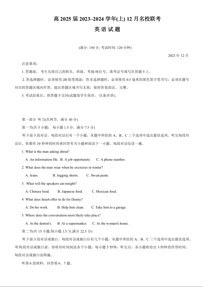 重庆市育才中学、西南大学附中、万州中学2023-2024学年高二上学期12月联考英语+答案