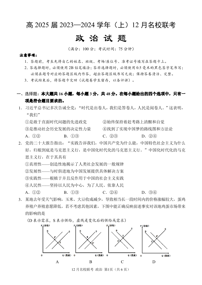 重庆市育才中学、西南大学附中、万州中学2023-2024学年高二上学期12月联考政治+答案