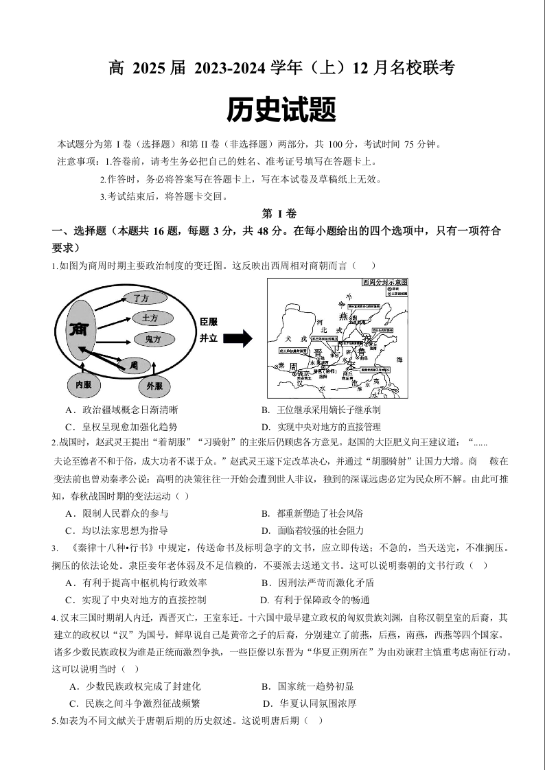 重庆市育才中学、西南大学附中、万州中学2023-2024学年高二上学期12月联考历史+答案