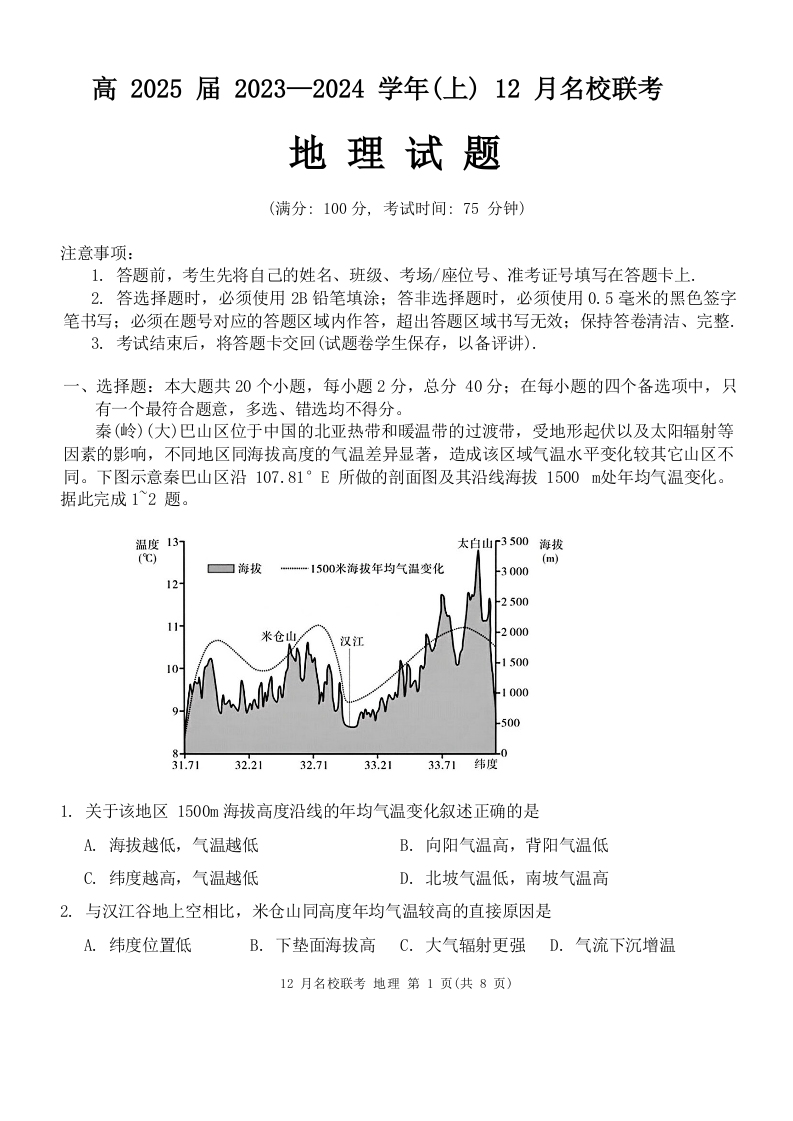 重庆市育才中学、西南大学附中、万州中学2023-2024学年高二上学期12月联考地理+答案