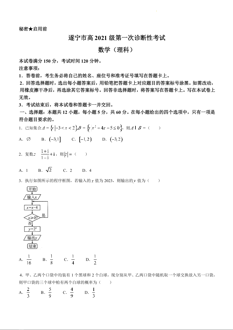 四川省九市高2021级第一次诊断性考试理科数学