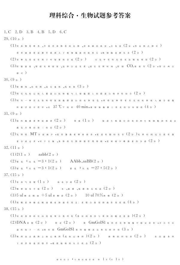 四川省九市高2021级第一次诊断性考试生物答案