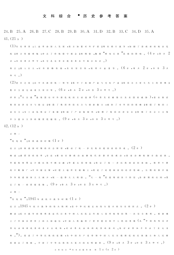 四川省九市高2021级第一次诊断性考试历史答案