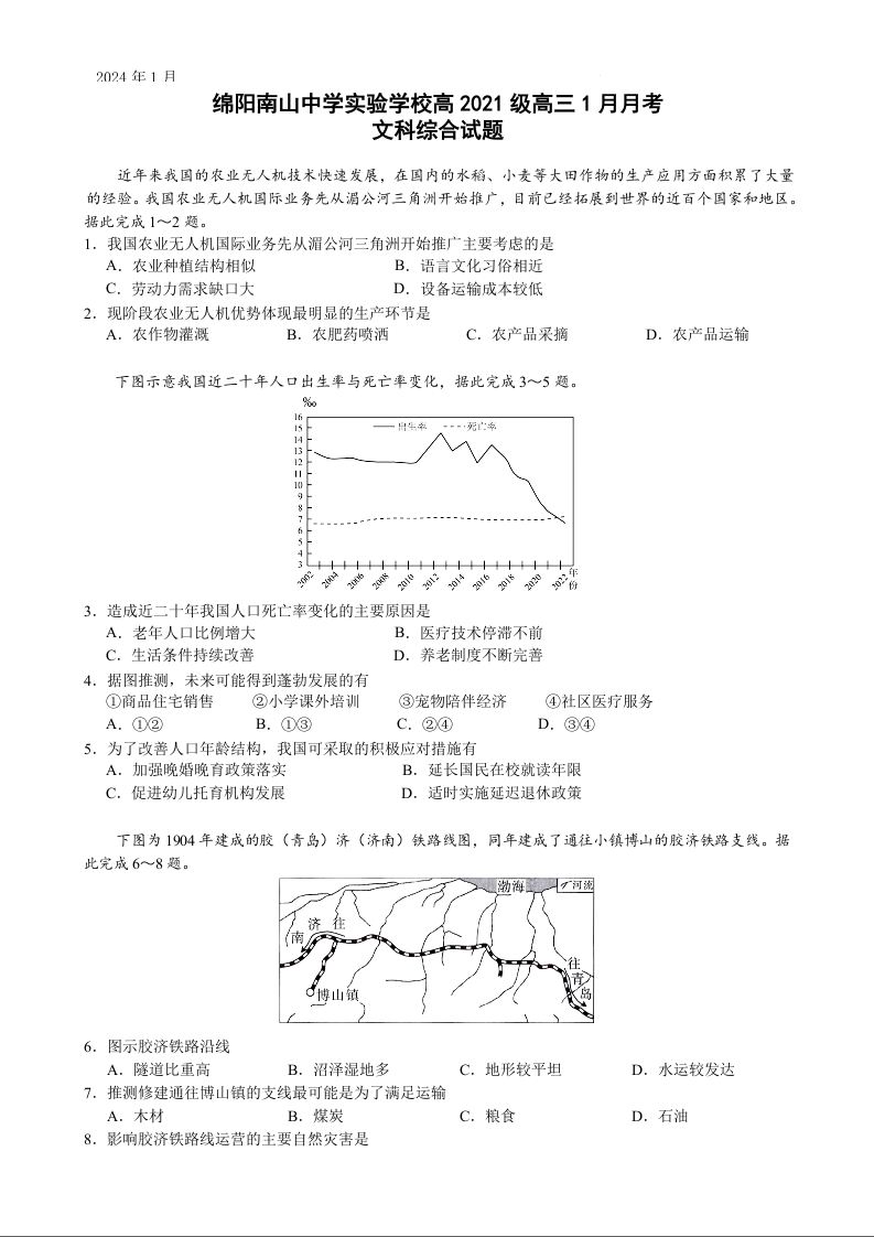 四川省绵阳南山中学实验学校2024届高三上学期1月月考文综+答案