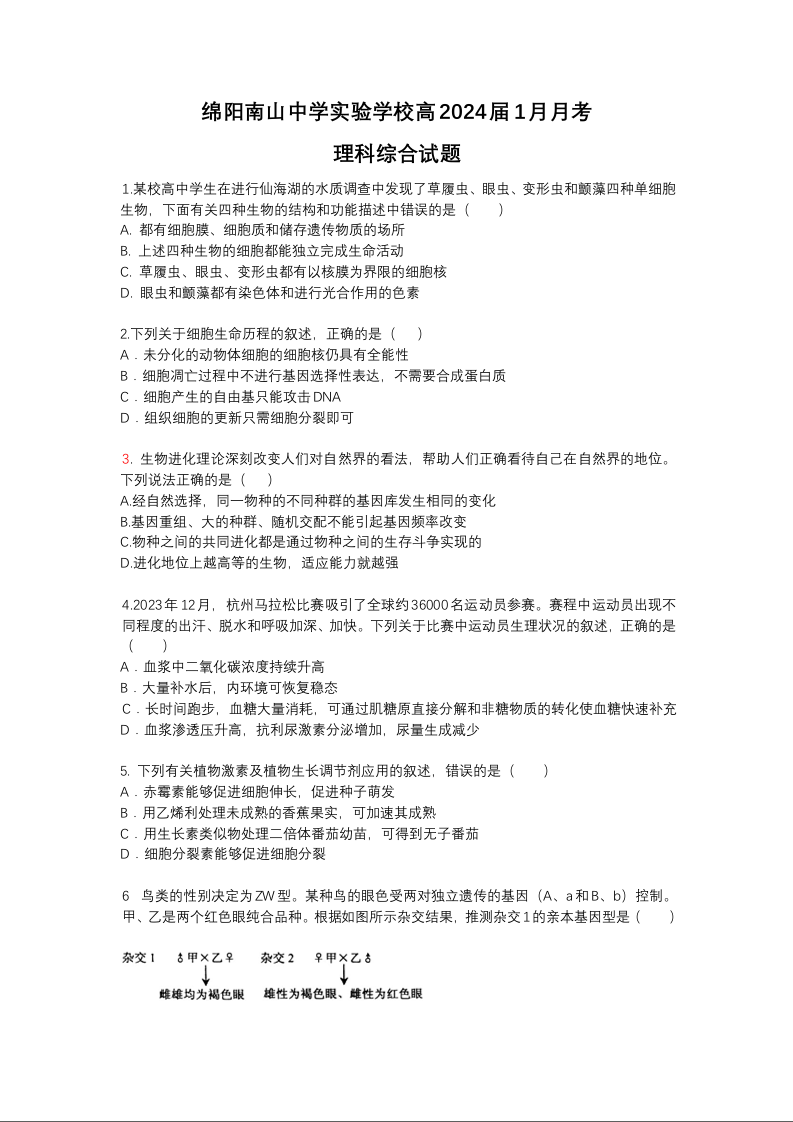 四川省绵阳南山中学实验学校2024届高三上学期1月月考理综+答案