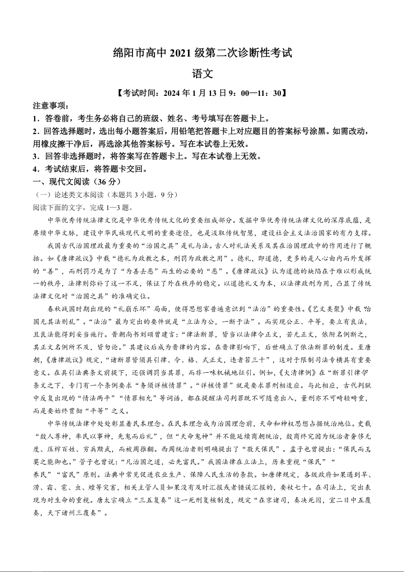 四川省绵阳市2024届高三上学期第二次诊断性考试(二模)语文