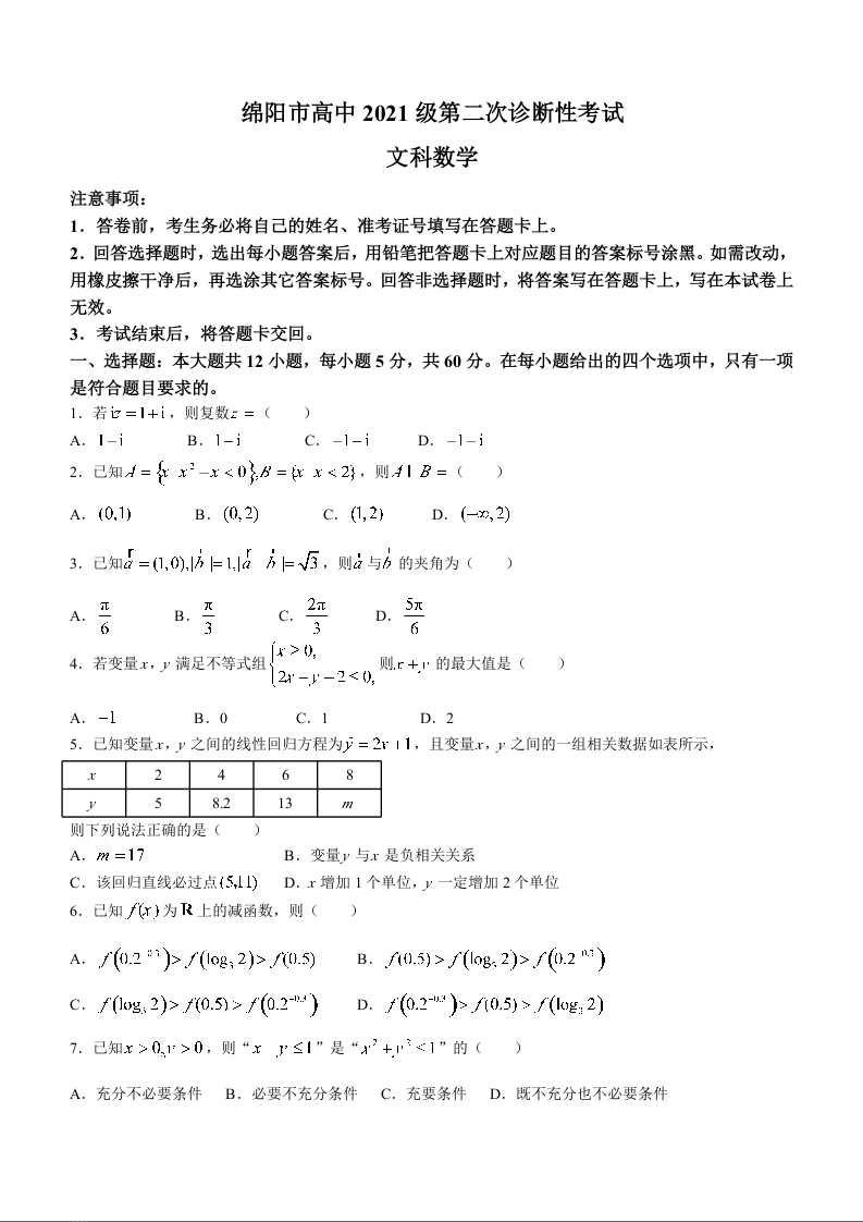 四川省绵阳市2024届高三上学期第二次诊断性考试(二模)文科数学
