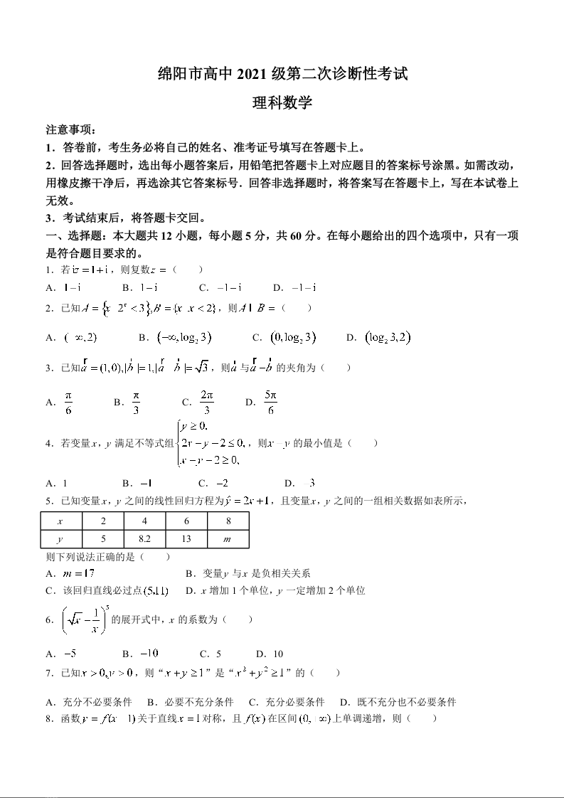 四川省绵阳市2024届高三上学期第二次诊断性考试(二模)理科数学