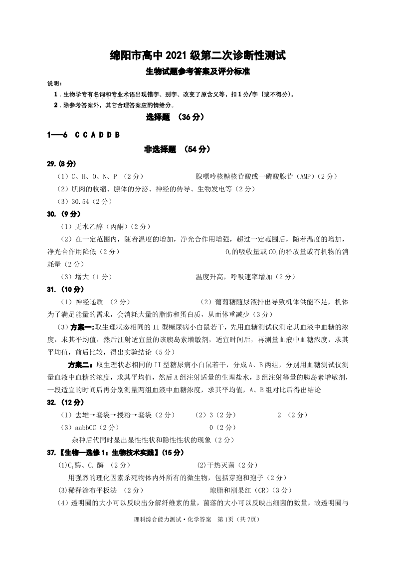 四川省绵阳市2024届高三上学期第二次诊断性考试(二模)理综答案