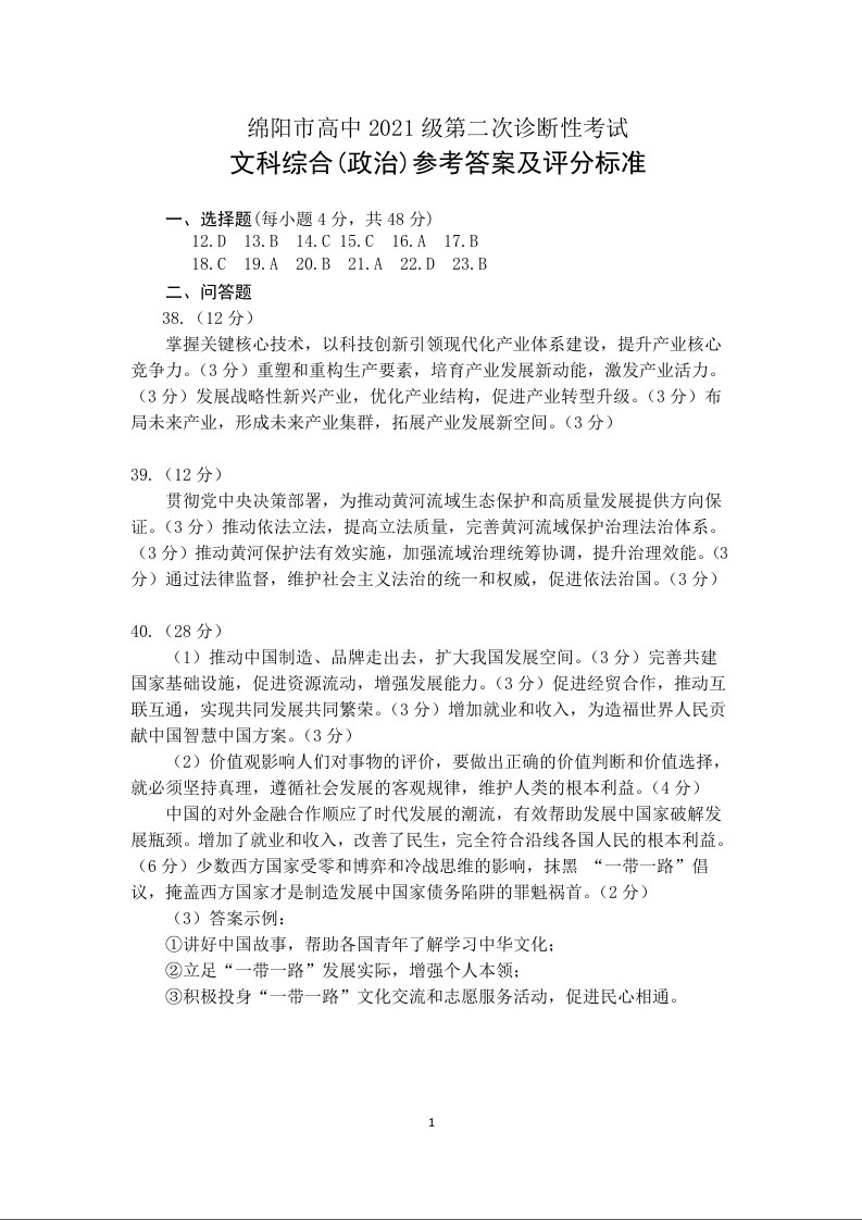 四川省绵阳市2024届高三上学期第二次诊断性考试(二模)政治答案