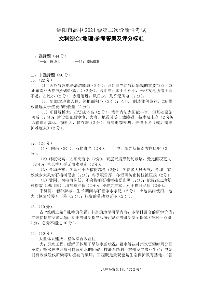 四川省绵阳市2024届高三上学期第二次诊断性考试(二模)地理答案