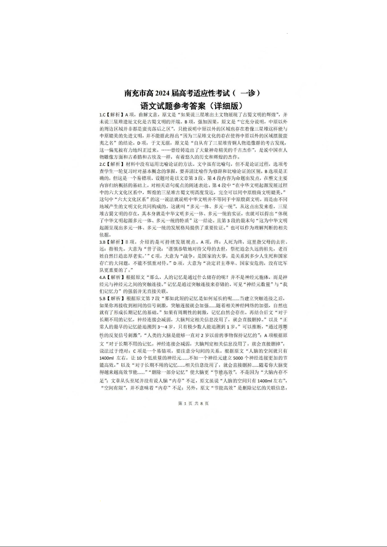 四川省南充市2024届高三上学期一诊考试语文答案