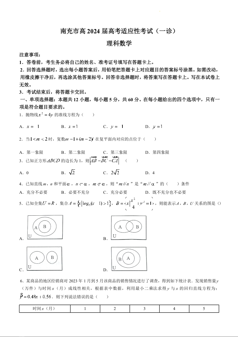 四川省南充市2024届高三上学期一诊考试理科数学