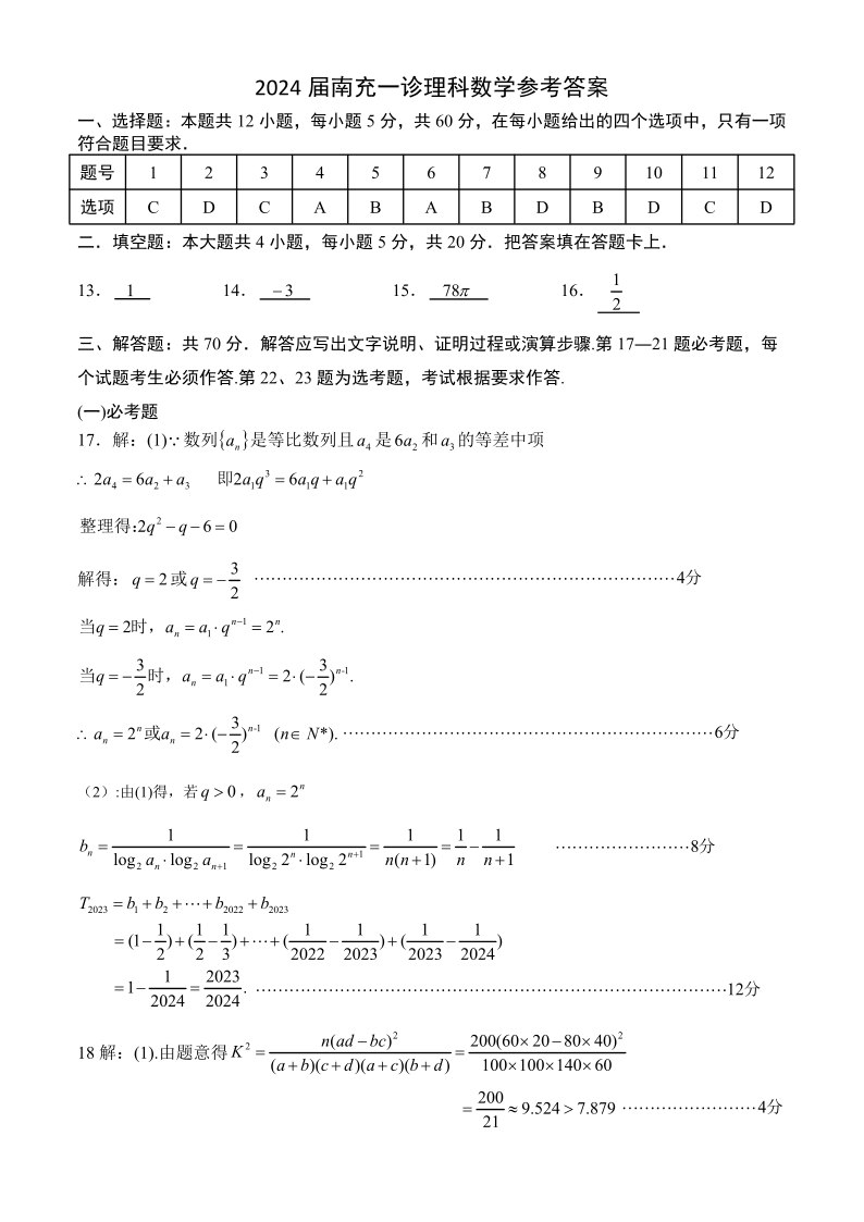 四川省南充市2024届高三上学期一诊考试理科数学答案