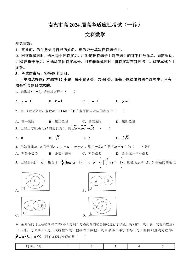 四川省南充市2024届高三上学期一诊考试文科数学