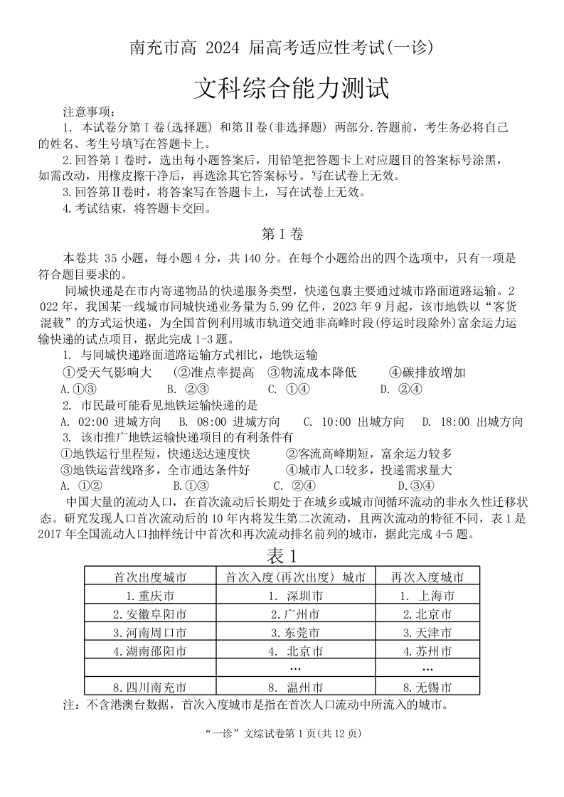四川省南充市2024届高三上学期一诊考试文综