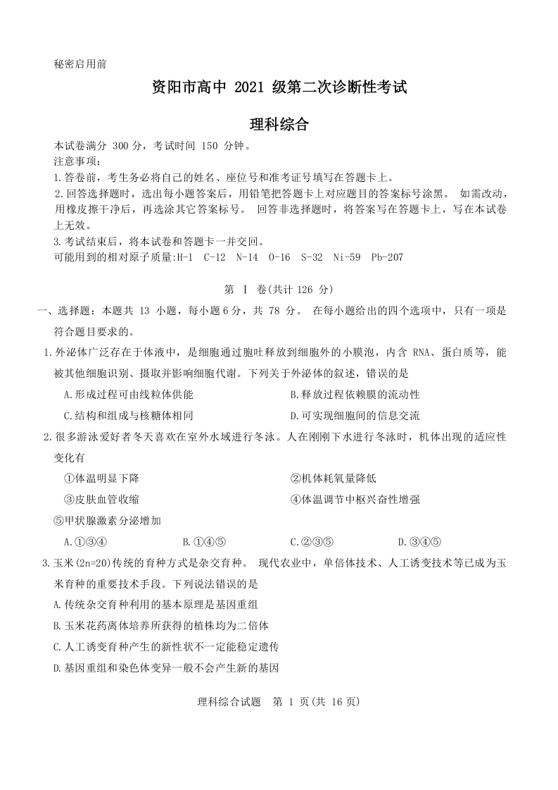 四川省资阳市高中2024届高三第二次诊断性考试理科综合