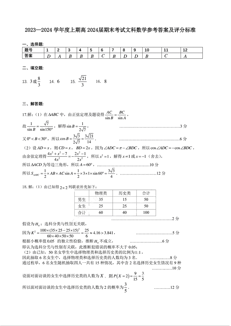 四川省成都市第七中学2024届高三上学期期末考试文科数学答案