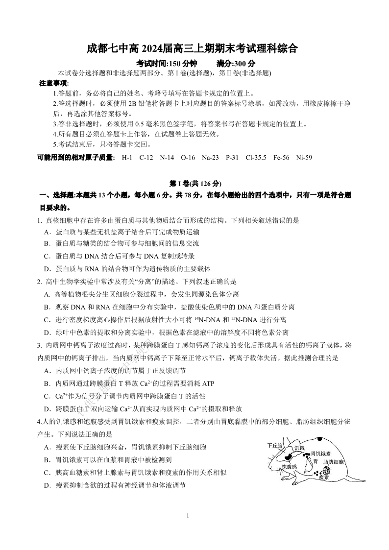 四川省成都市第七中学2024届高三上学期期末考试理科综合