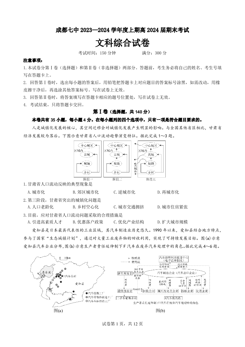 四川省成都市第七中学2024届高三上学期期末考试文综+答案