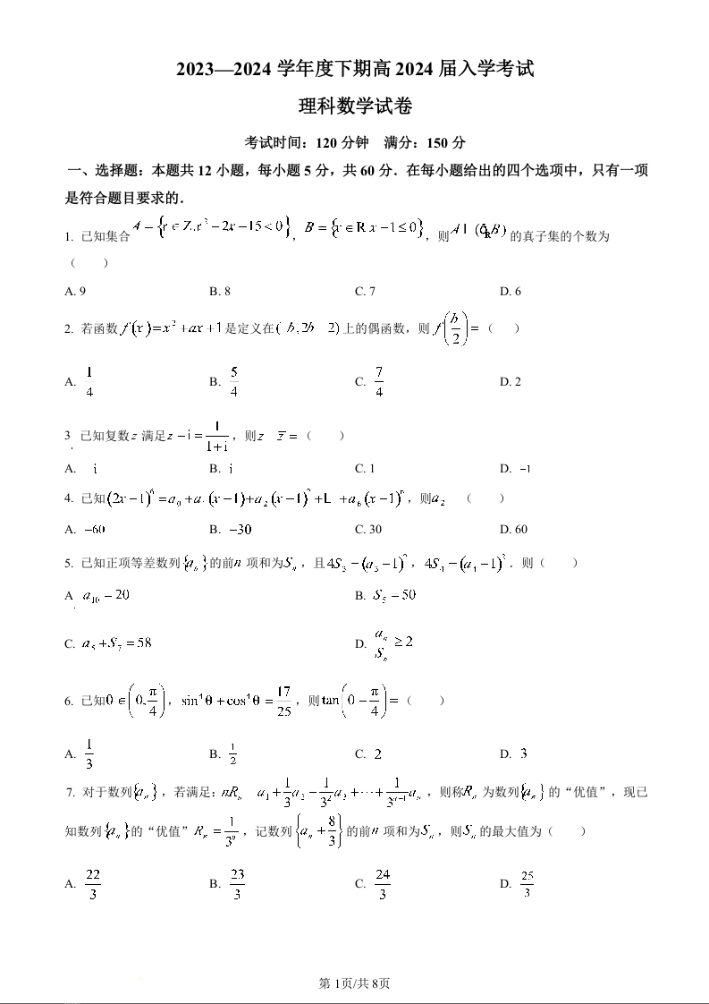 四川省成都市第七中学2024届高三下学期入学考试理科数学