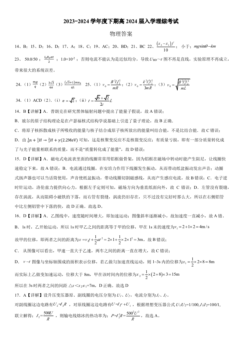 四川省成都市第七中学2024届高三下学期入学考试理综答案