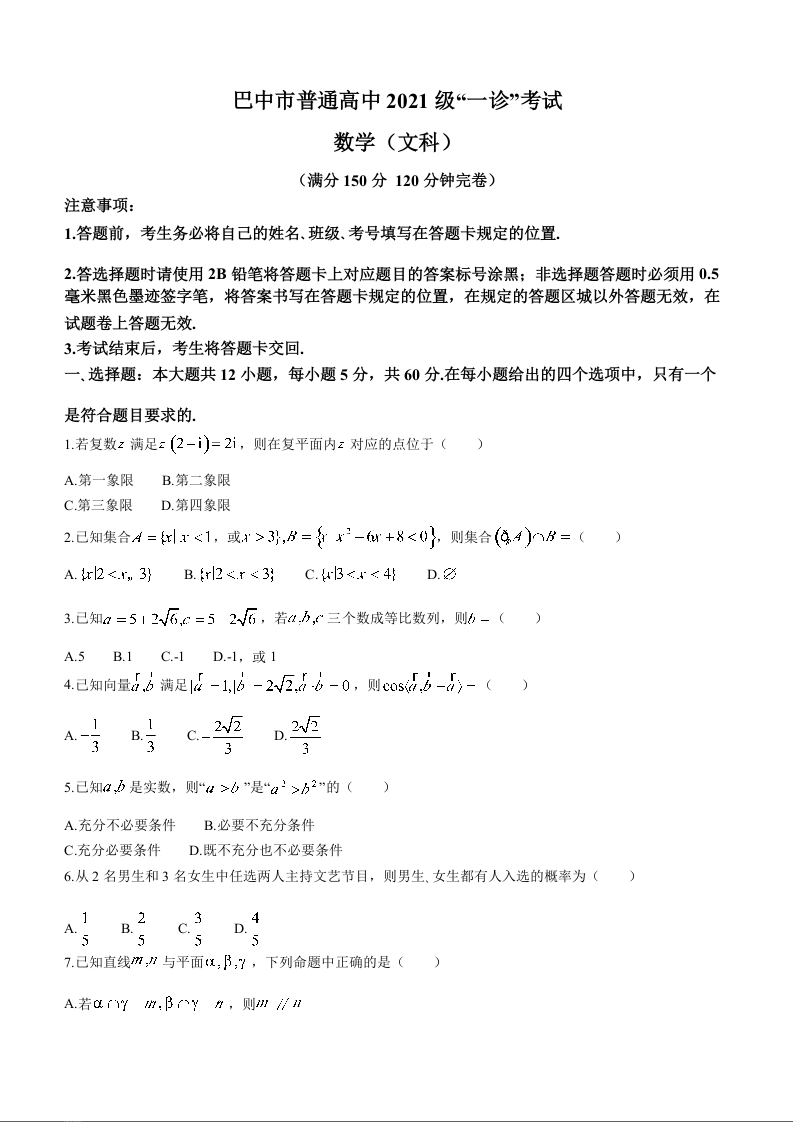 四川省巴中市2024届高三下学期一模考试文科数学+答案